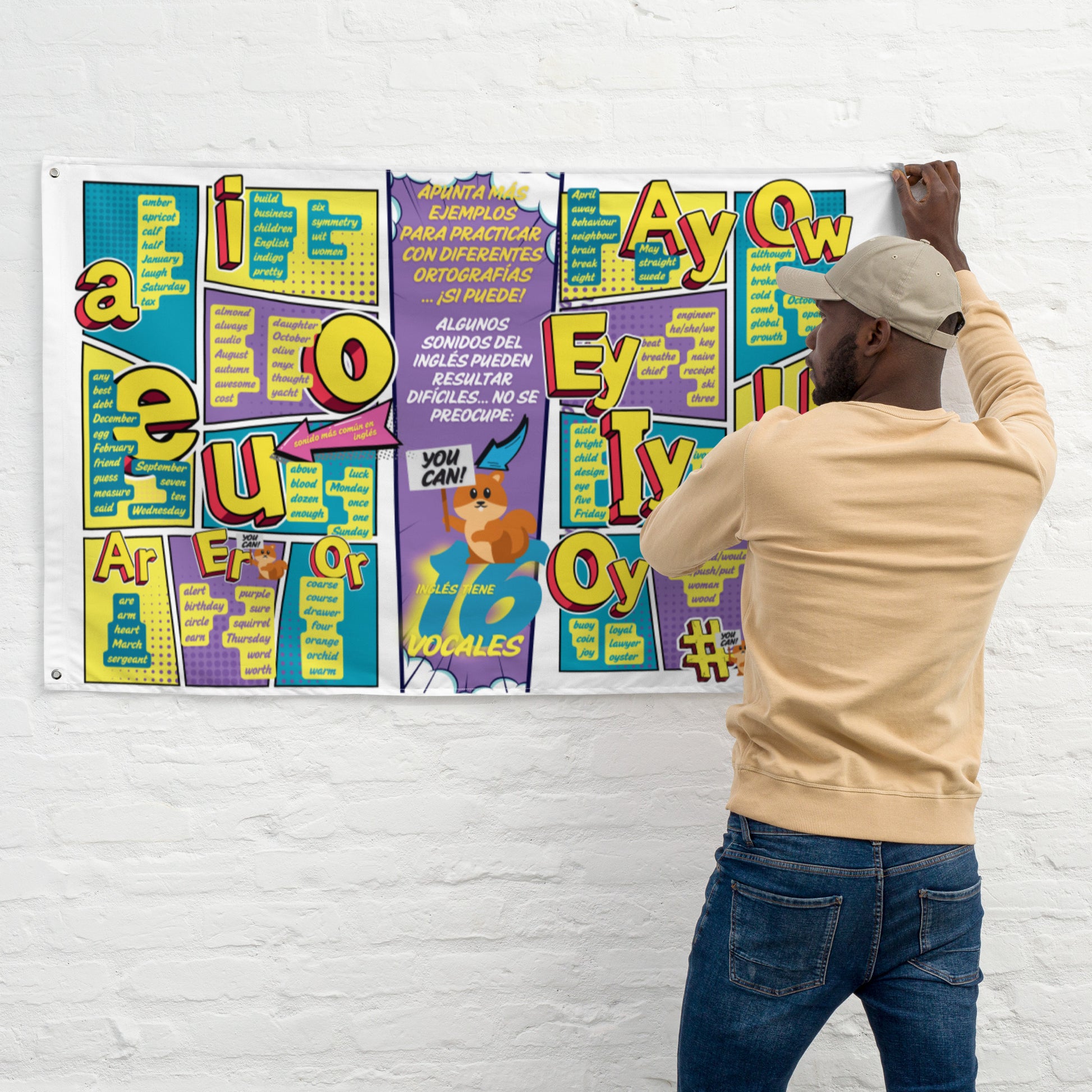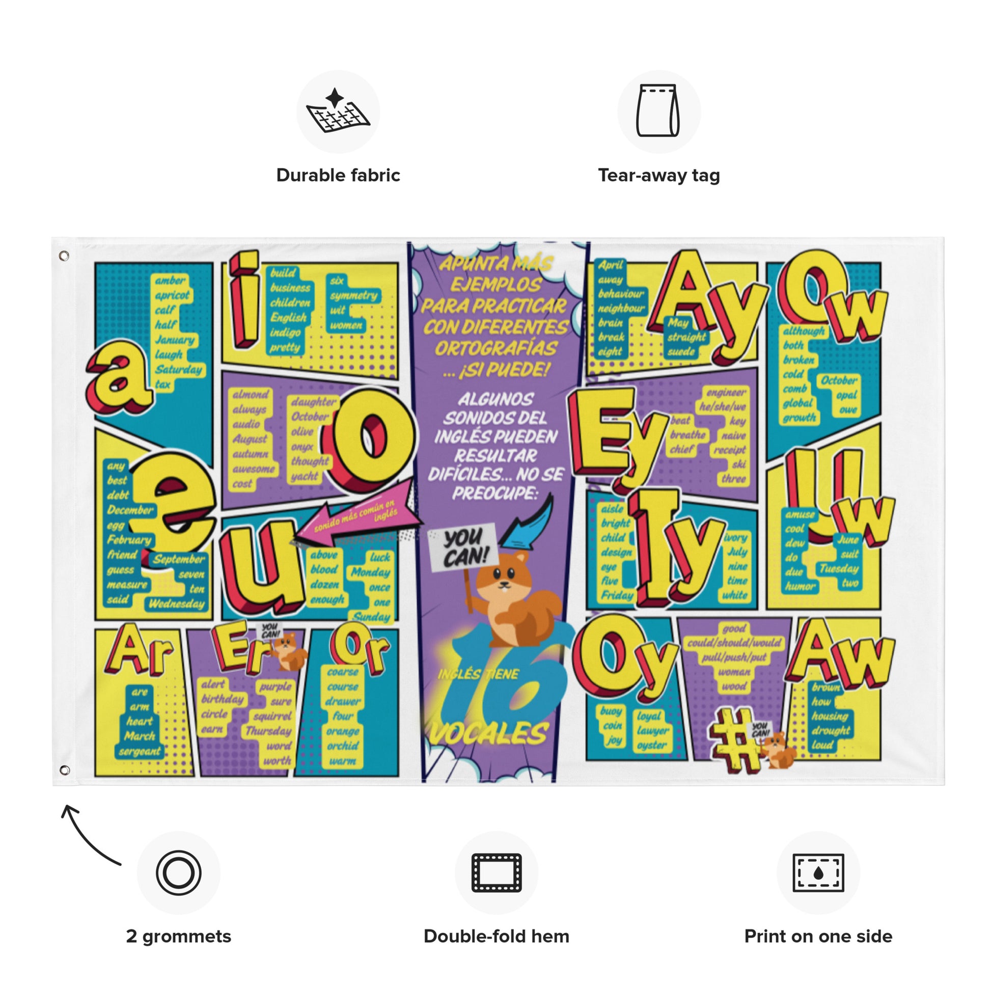 Sumerge la clase en el mundo de las vocales y mejora la pronunciación en inglés con nuestra guía dinámica y atractiva en formato de bandera gigante (156x97cm!).